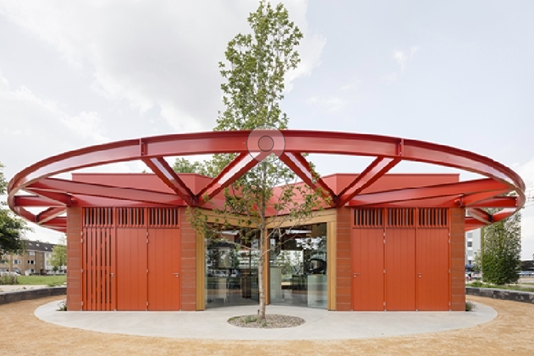 Het veelzijdige paviljoen bestaat uit een rond betonnen terras, een rechthoekig bouwvolume en een ronde, stalen luifel. Het carrouselachtige gebouw staat in het midden van de ovaal met aan de ene kant een speelplek voor kinderen met verborgen fonteintjes en aan de andere kant de tafels en stoelen voor het terras. De betonnen banken vormen het startpunt voor een bootcamp of een looptraining.