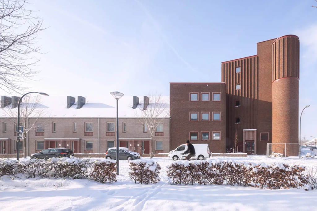 Het appartementengebouw sluit aan op de infrastructuur aan de noordzijde en vormt een rug voor de wijk en biedt bescherming tegen geluid. De brede galerijen met bankjes creëren kleine opgetilde woonstraten. De afgeronde hoek markeert het scharnierpunt naar de Groene Loper. De kroonlijst en geribbelde bovenzijde brengen schaal en textuur aan het volume, terwijl rode geglazuurde stenen de accenten markeren. Zo ontstaat een ensemble dat zorgvuldig bemiddelt tussen wijk, infrastructuur en stad.